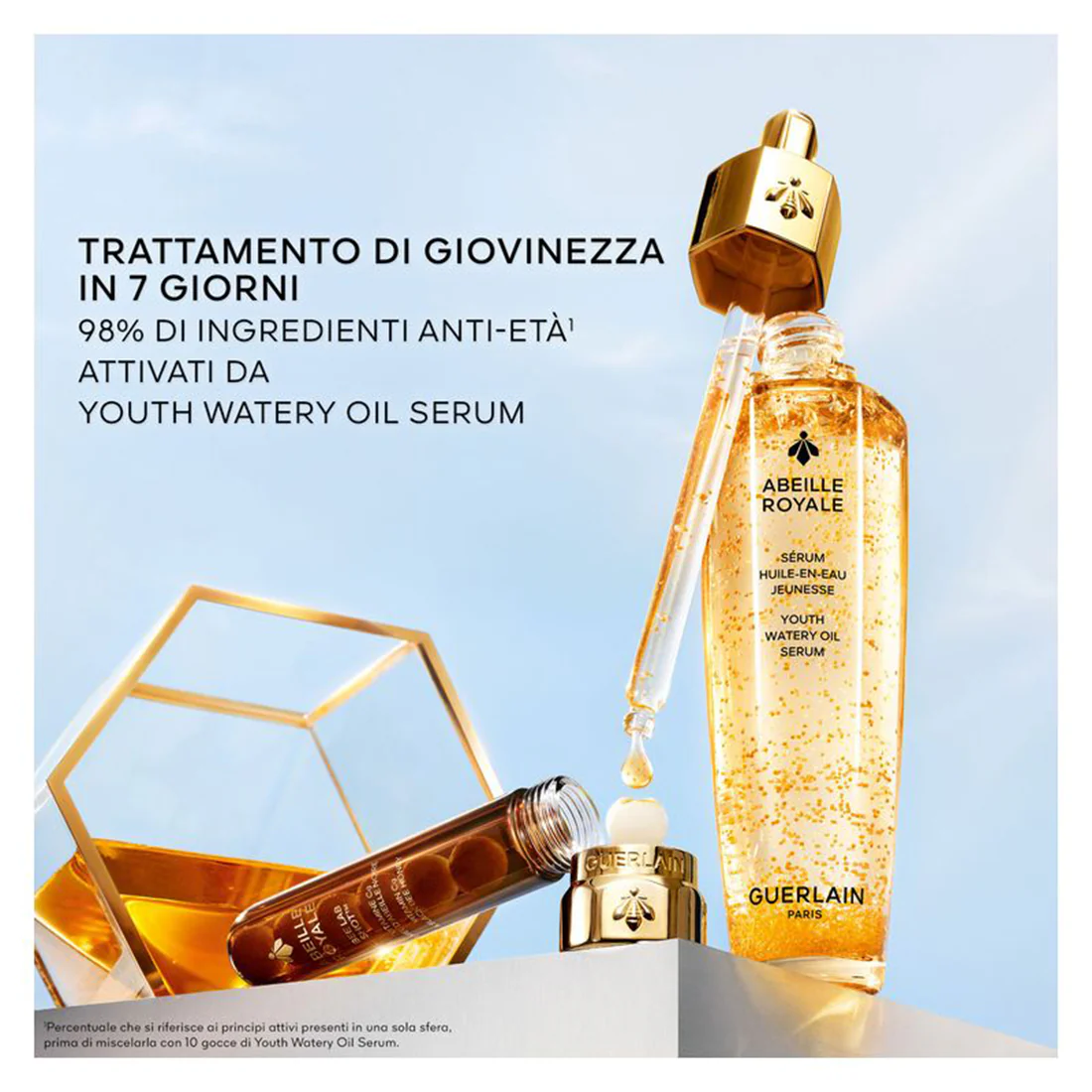 Riparazione profonda dei segni del tempo fin dalle prime gocce¹. Youth Watery Oil Serum abbina 3 mieli riparatori dell'Ape Nera per moltiplicare i meccanismi di riparazione cutanea. La pelle è visibilmente più giovane e le rughe sono ridotte.
